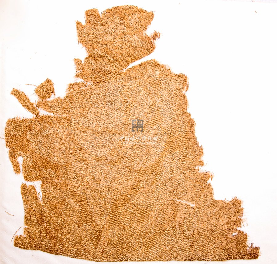 形状内容描述 此为一件典型的辽式纬锦织物,以五枚缎纹纬重组织显花,黄色纬线为地,显花纬线的颜色已有褪色,难以分辨其本色。以繁复的宝花纹样为主要表现题材,每边各点缀一只飞翔的大雁纹样,组成团窠状图案,其图案半径约在16厘米左右。