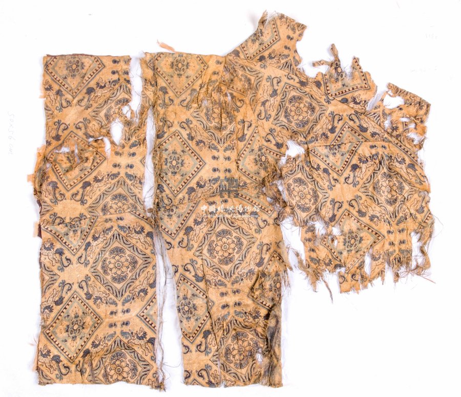 形状内容描述 该织物较残,但仍能清晰看出其上纹样为黄地菱格花卉奔兽纹。纹样的中心是一个菱格,内织花卉一朵,似为宝相花,或称作宝花。这是一种综合了各种花卉因素的想象性图案,它虚实结合、真假难辨、四季相间、正侧相叠,在唐代盛极一时。菱格的四边分别织有一头奔兽,似为狮子。狮子纹自从引入中国后,也是长盛不衰,一直为人们所喜爱。