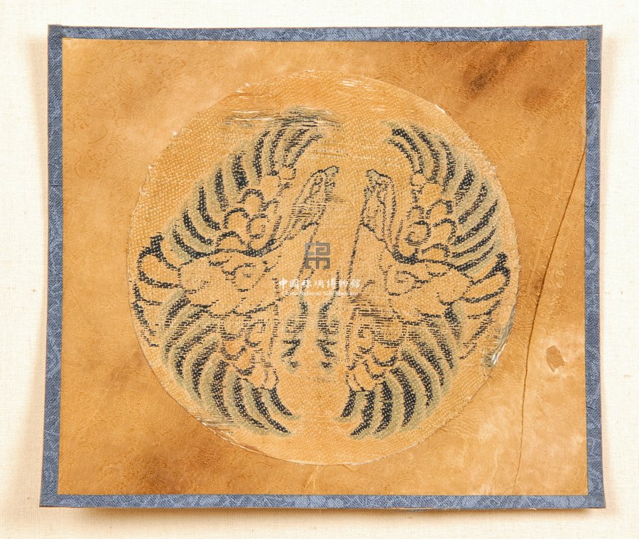 形状内容描述 此为辽式斜纹纬锦残片。锦以深蓝、浅绿、黄等色,地部黄色以1/2S斜纹辽式纬锦组织,花部以深蓝、浅绿色起纬浮花。图案采用对称设计,沿袭自唐至辽宋的风格,主题纹样具有团窠外形,却无团窠环,团窠主体是一对驻足展翅鸽子,昂首挺胸,具有典型的辽代游牧民族特性。
