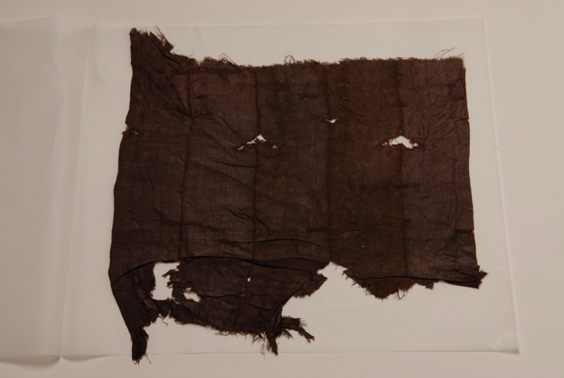 描述:该残片为一深褐色方点纹绫。绫,即一种斜纹地的暗花织物。方点纹,属于小几何纹,这类纹样在战国时期就已出现。