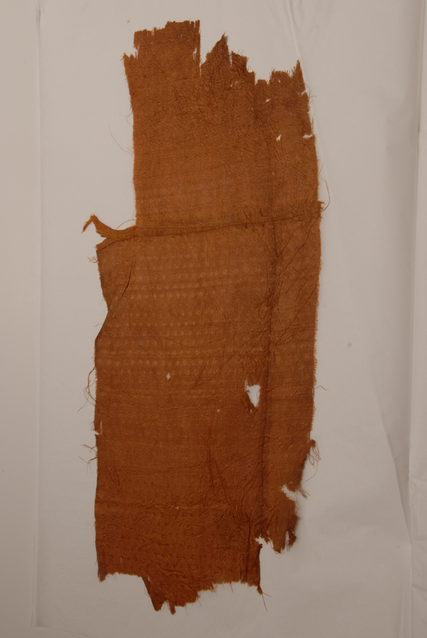 描述:该残片为一浅褐色方点纹绫。绫,即一种斜纹地的暗花织物。方点纹,属于小几何纹,这类纹样在战国时期就已出现。