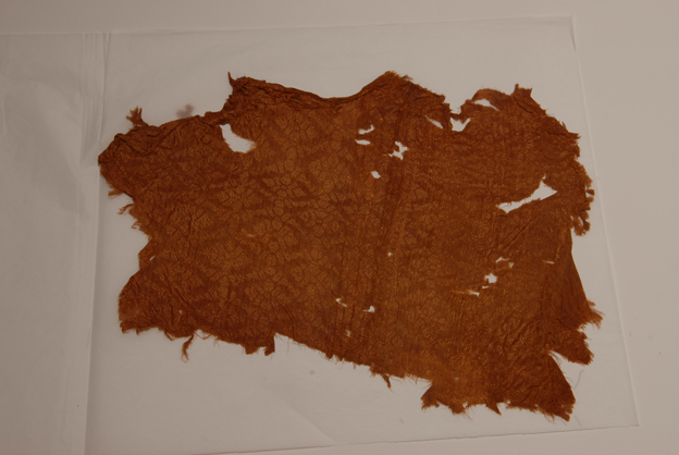 描述:该织物为一菱格小花绮残片。绮的名称出现较早,一般把平纹地显花织物称为绮。