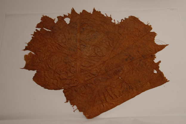 描述:该织物出土于内蒙阿鲁科尔沁旗耶律羽之墓,为一暗花绫织物,图案为朵云纹样,较为残破。