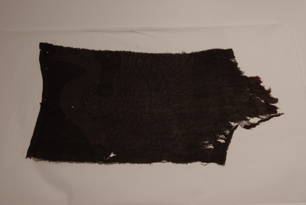 描述:该织物为一大雁纹绫残片。绫,即一种斜纹地的暗花织物。大雁纹,在辽代出现较多,是比较受欢迎的纹样。