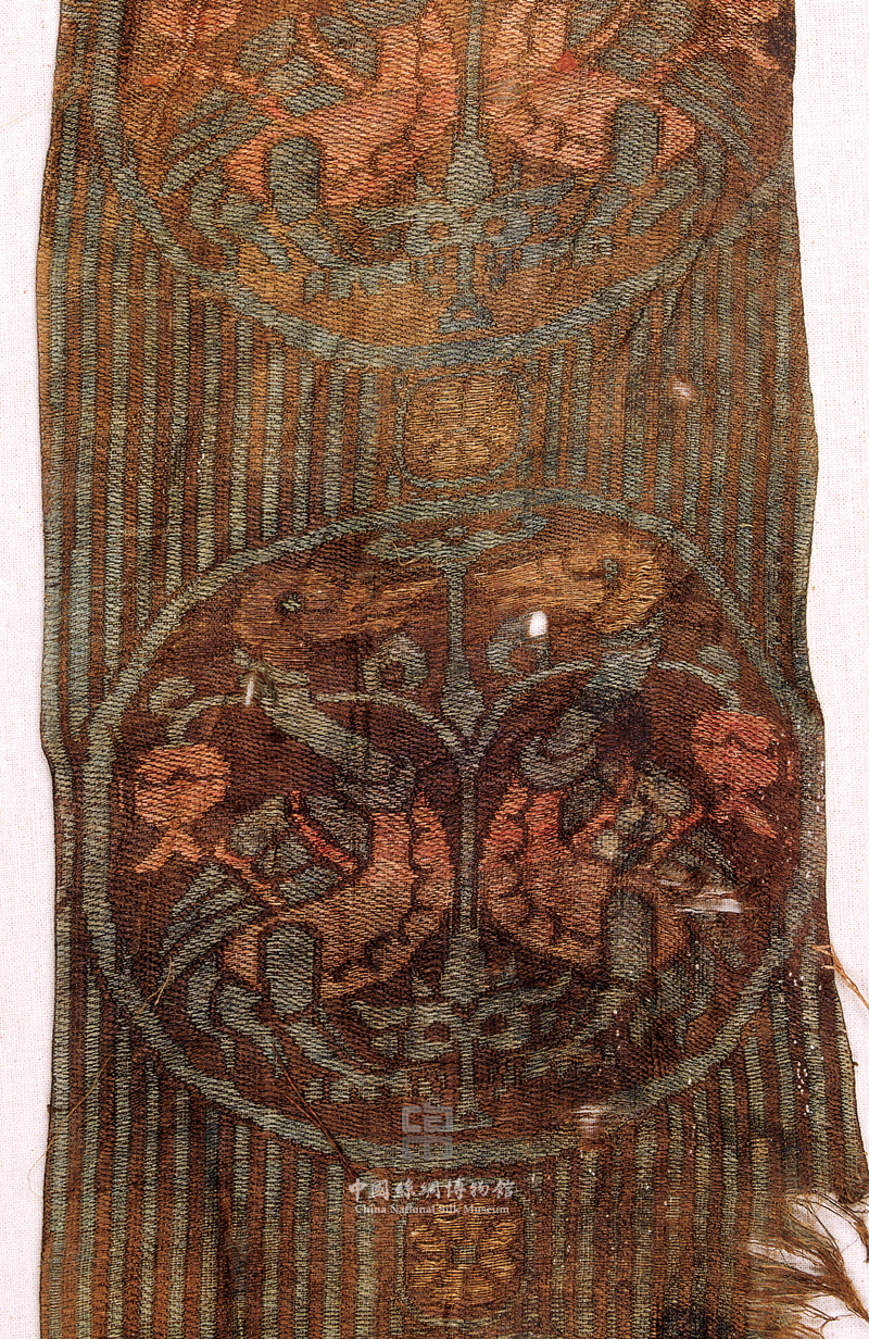 以锦以蓝、褐相间的条纹作地,环形团窠中有对鸟衔花图案,鸟身带红色,花作黄色。织物采用传统的、典型的唐式斜纹纬重组织,即织物正反面各为纬面和经面效果。这类组织在唐代被看做是称为赞丹尼奇的中亚粟特锦,而此锦年代当在宋元之间,图案具有明显的中亚西亚的伊斯兰风格,说明当时中亚依然沿用这一技术,或正是元代文献中所载的撒搭剌欺织锦。