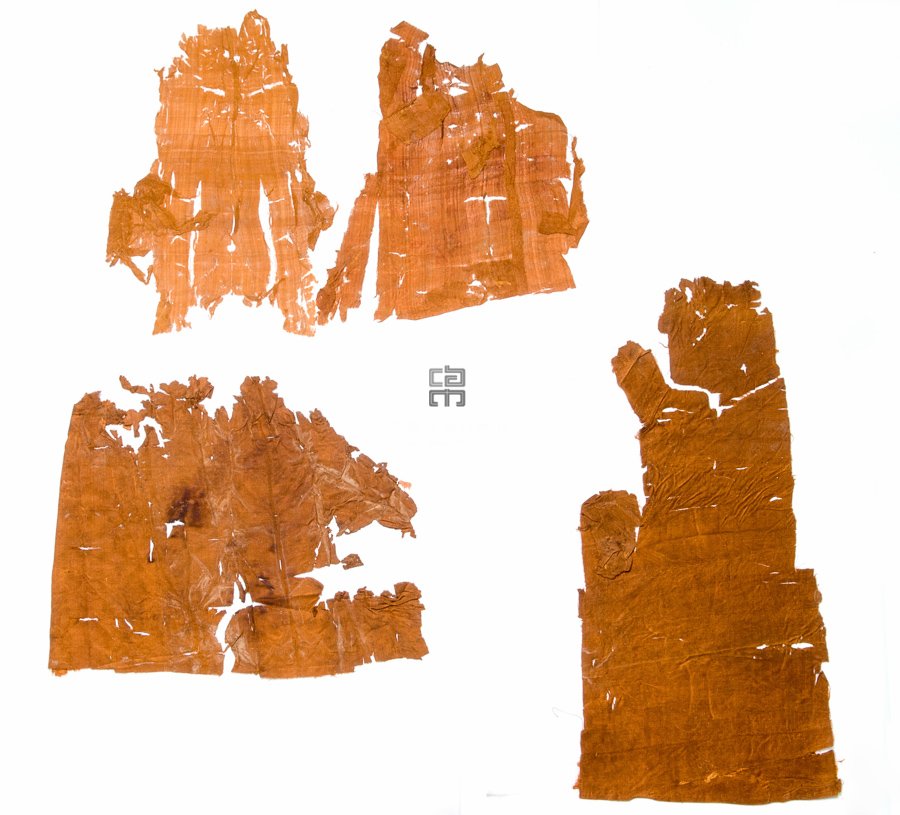 形状内容描述 该织物残片为一红色绢织物残片。所谓绢织物,其实是对平纹类素织物的统称。不过,绢成为通称是较迟的事。早期对平纹类素织物有帛、缯等称呼。