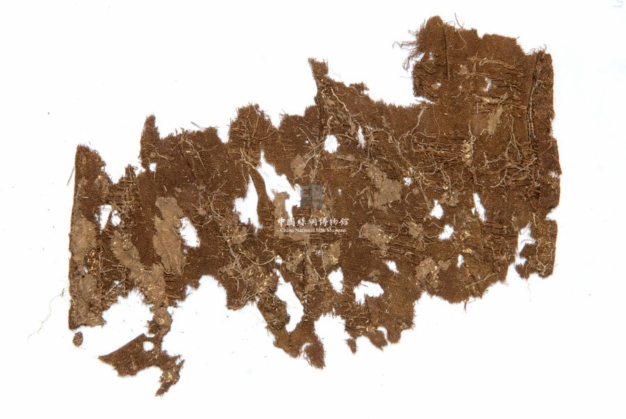 形状内容描述 该织物残片为一褐色织金绢残片。丝织物上用金,原出于对豪华富贵的追求,元代更是盛行。织金绢,属于地络类织金织物,运用的是传统的织造技术。
