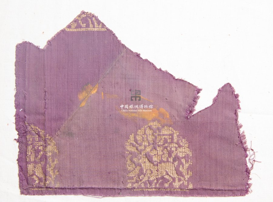 形状内容描述 该织物残片为一奔鹿纹织金锦。鹿纹是辽金元时期常见的丝绸纹样,属于"春水秋山"意味的北方特色纹样。而织金锦又是蒙元时期最重要的织物,元代统治者对黄金丝绸的推崇爱好令织金锦在元代红极一时。