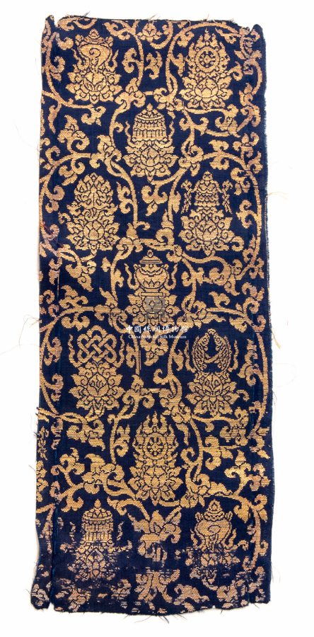 形状内容描述 此为零料,深蓝地上有完整缠枝八吉祥纹样,织物有一组经线,深蓝色,两组纬线,分别为深蓝色丝线及金线,是典型的地结类织金织物,其地组织采用了缎组织。