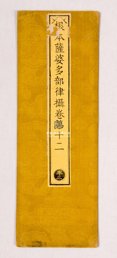 形状内容描述 此件织物原用作佛经的封面,以明黄色花罗制成,其图案为明代典型的四合如意云纹样。经皮子中间贴有黄色签条,上题"根本萨婆多部律摄卷第十二"。