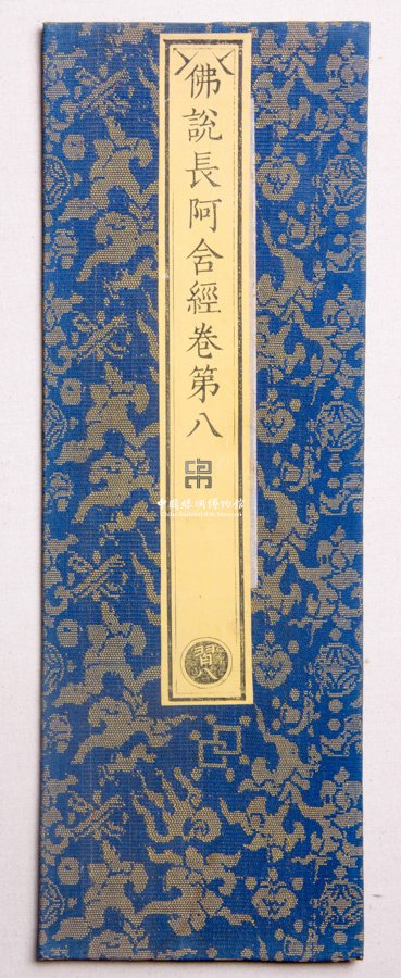 形状内容描述 此件织物原用作佛经的封面,以丈青色花罗制成,其上以黄色纹纬起花,主体图案为花卉纹样,并在空白处点缀有杂宝纹样。经皮子中间贴有黄色签条,上题"佛说长阿含经卷第八"。