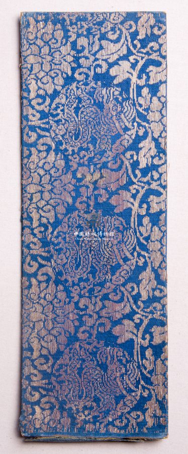 形状内容描述 此件织物原用作佛经的封面,以蓝色织金缎制成,其主体为团龙纹样,四周装饰有莲花纹样,经皮子周围有破损。
