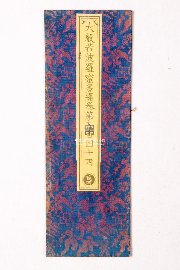 形状内容描述 此件织物原用作佛经的封面,以深蓝色花罗制成,其上以铁红色纹纬起花,织物主体图案为檀板、银锭等杂宝纹样。经皮子中间贴有黄色签条,上题"大般若波罗蜜多经卷第五百四十四"。