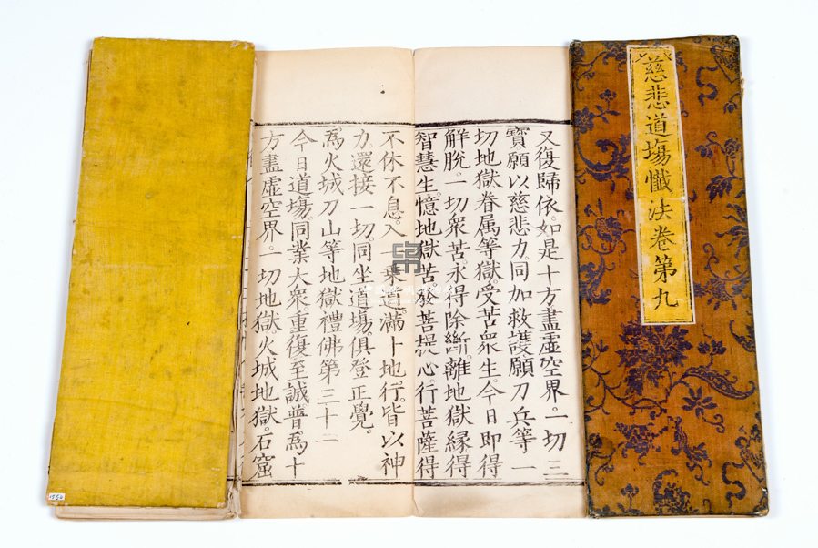 形状内容描述 该经书的经皮子,采用木红色花卉纹缎为面料,经纬异色。经皮子上贴一黄色签条,上书"慈悲道场忏法卷第九"。