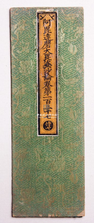 形状内容描述 该经皮子,采用绿色曲水花卉纹织金缎为面料。织金缎在明清时期应用广泛。曲水纹在《营造法式》中有提到,它是直线正交构成的几何纹样。