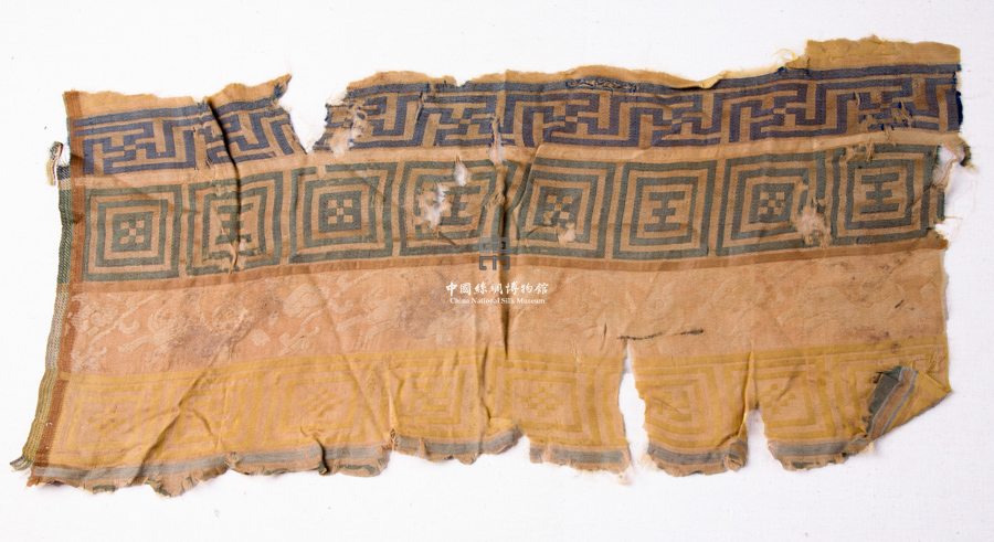 形状内容描述 该件是一件缎织物,征集自青海民间,略有残破。织物采用分道换梭,其主要图案为一排奔跑的兔子,身姿矫健,上下方还有一些几何形装饰纹样。