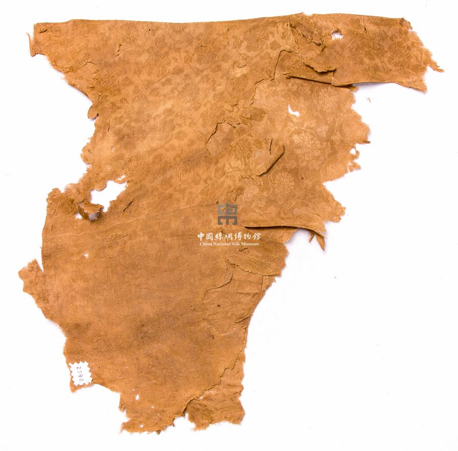 形状内容描述 该件为残片,熟褐色。织物组织结构为正反五枚暗花缎。图案是缠枝花卉纹,花似 菊花和芙蓉,每排相间排列。花循环不大,经向是8cm,纬向为5cm。