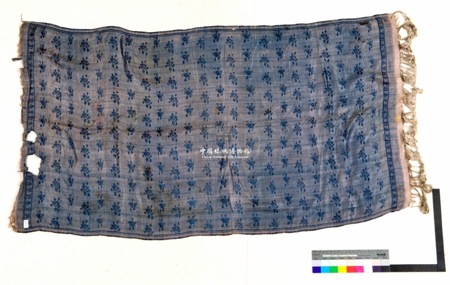 形状内容描述 此块织物征集自北京民间,以蓝色做地,其上织有深蓝色折枝小花卉,两端分别织有狭长形的带饰,一端还残留有流苏。