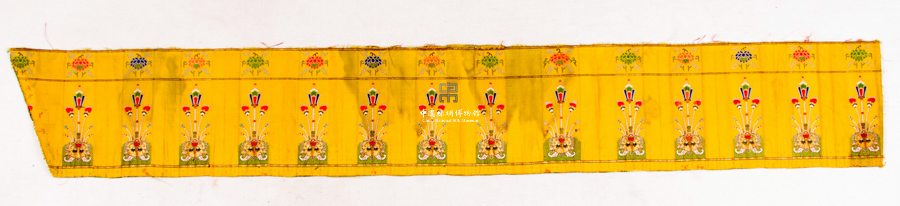 形状内容描述 此为一匹明代璎珞纹妆花缎匹料,以明黄色做地,用妆花技法在其上挖织出头生有两角的兽面及璎珞纹样,并以绿、红、蓝丝线织出各色莲花装饰于边缘。