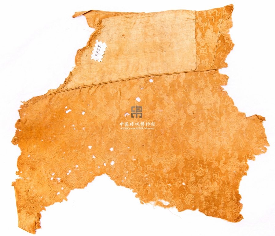 形状内容描述 该件应是一件衣服的残片,尚能见类似门襟或者衣领的一角,宽8.2cm,与明代斜领以及门襟的尺寸相符,并可见该处的背面缝有相同宽度的1/1平纹绢。该织物组织结构为正反五枚暗花缎。图案是四合如意云纹,云纹间饰有双胜、宝珠、犀牛角等杂宝纹样。花循环经向为8.5cm,纬向是5.5cm。