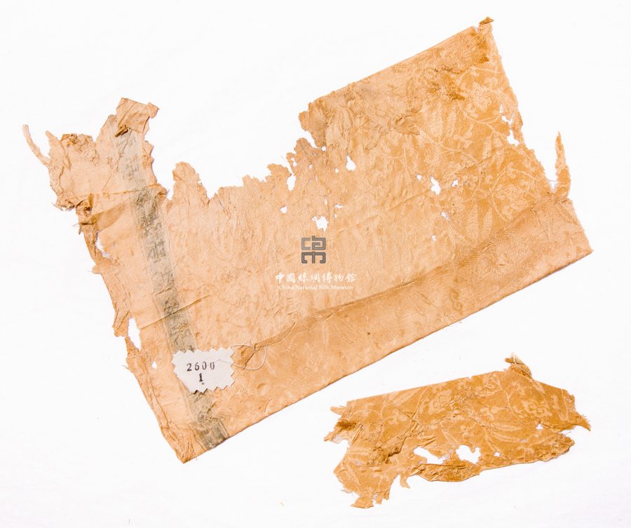 形状内容描述 该件为正反五枚暗花缎,黄色,光泽较好,图案为缠枝平安竹如意云纹,图案循环经向为4cm,纬向为5.5cm。该件有机边,上面有"张梦阳"字样,这应该是织造者的名字,对我们断代和研究提供了非常有价值的信息。