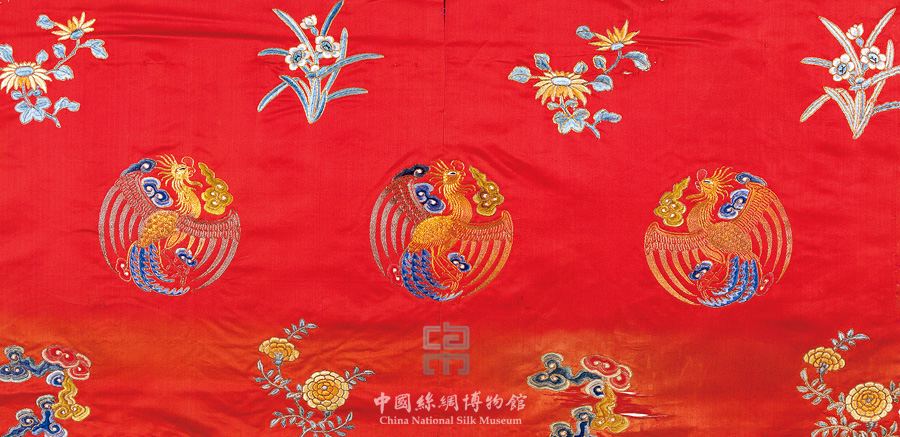 大红缎地团凤盘金绣