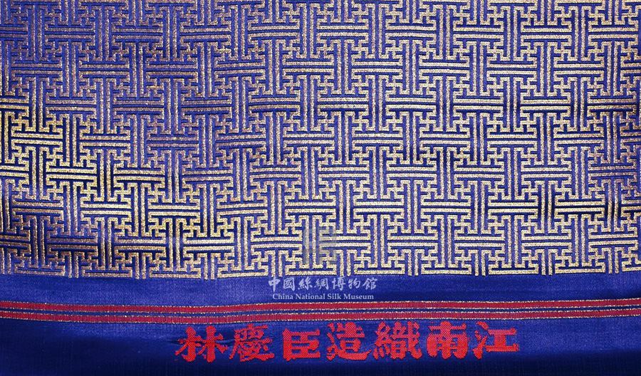 简介:完整匹料,通幅78厘米,缎纹加银织物,月白色地,银线起曲水万字纹花,有机头落款为“江南织造臣庆林”(1871-1874在任)。