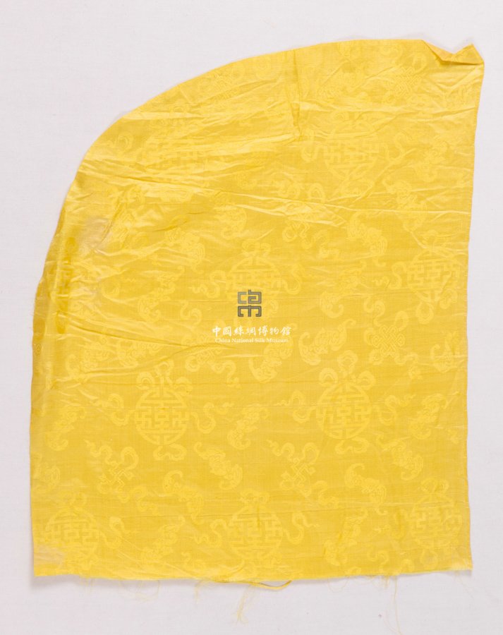 形状内容描述 此块为织物零料,呈明黄色,以正反缎组织起花,图案为团寿、蝙蝠及盘长等杂宝纹样,取"万福万寿"之意。