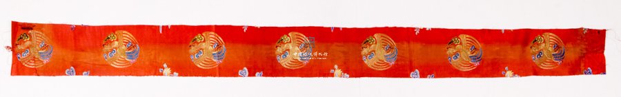 形状内容描述 该织物为一红色缎,其上彩绣团凤灵芝花草纹样。凤凰作为历代皇后的象征,在清代其造型技巧达到了更高的境界,写生风格上升,局部刻画精细。