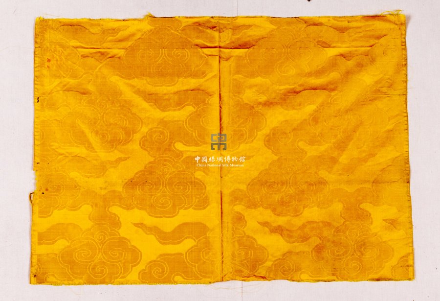 形状内容描述 该织物为一明黄色暗花缎。其上纹样为四合如意连云纹。推断沿用了明代的风格。