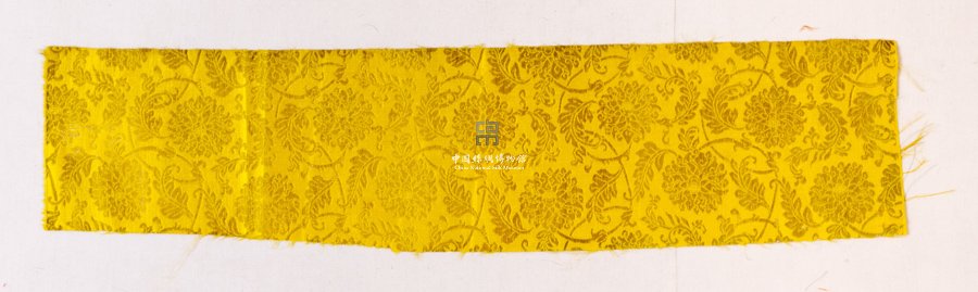 形状内容描述 该织物为一明黄地缠枝莲织银缎。织银缎为地结类织银织物,是一种插银织物。其所织纹样为缠枝莲。这类缠枝花卉纹样在明清使用广泛,不仅取材很广,而且不限蔓枝类的花卉,可任意截取。