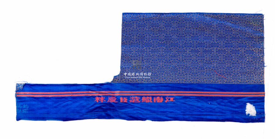 形状内容描述 该织物保存尚好。在翠蓝色的缎地上,呈现银卍字纹样。卍字原是佛教中的一种吉祥符号,到后来发展成为卍字不断头,寓意绵绵不绝。此织物落有织款"江南织造臣庆林"。织款最初源于中国古代官营作坊物勒工名的传统,即在产品上标明工匠的姓名。清代织物上的织款极多,道光年间更是剧增。