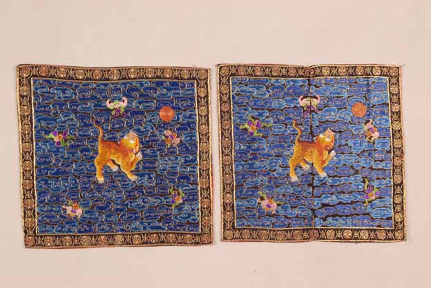 清黑缎地压金彩绣豹纹补,色泽亮丽,刺绣精巧。