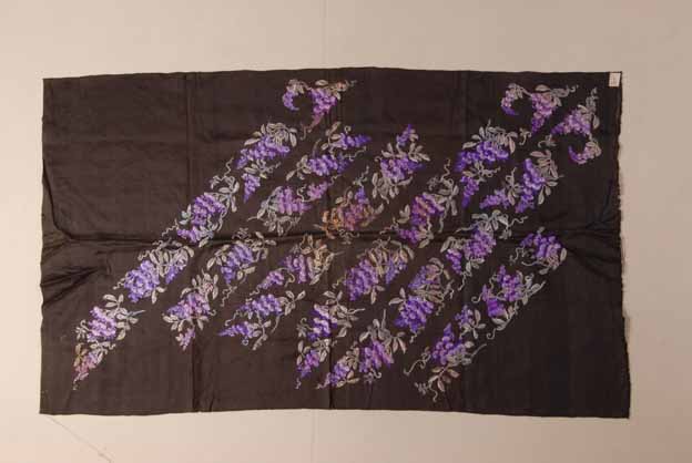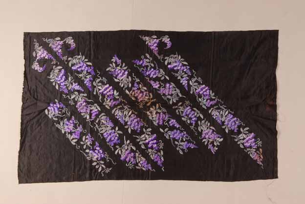 文物使用精湛的刺绣手法描绘紫色相间的藤萝花,枝叶缠绕,另现一番韵味,配合石青色的背景,花纹更加突出,同时斜向排列,寓意吉祥。