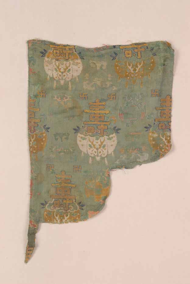 描述:此物为清代绿地万寿蝠纹样的妆花缎子。面上还绣有老鹰,整体呈不规则形。