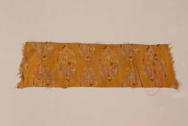 描述:此物为清代黄底樗蒲纹妆花样的缎子,面上规则的绣有6组双龙戏珠的图案。