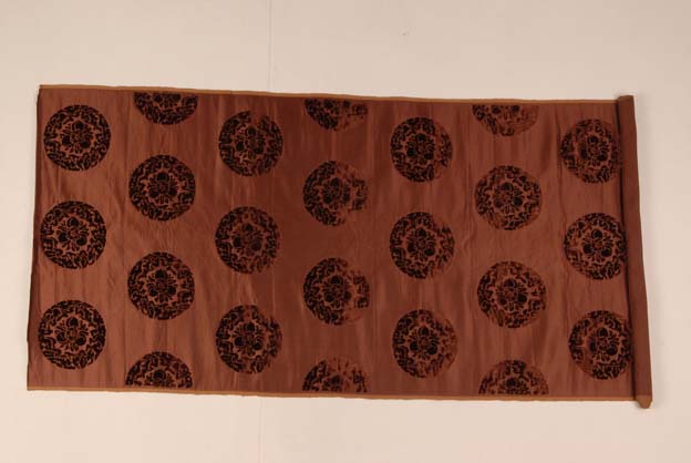 该件绒织物色彩鲜艳,品相较好。织物以缎纹作地,起绒组织为花,花为团花纹样。这类机织经面缎纹起绒花织物,人们常称之为漳缎。漳缎因盛产于漳州而得名。