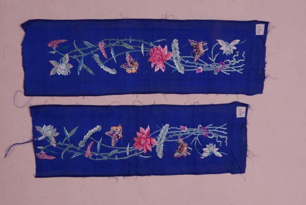 “挽袖”又称衣袖,是清代妇女上衣的装饰性袖口,多取刺绣工艺,针法多变,题材广泛。挽袖一般是一对,该挽袖在深蓝色地上彩绣蝴蝶、荷花、荷叶等纹样,此类纹样可称作“蝶恋花”,寓意美好的爱情,故深受人们喜爱。所用针法以平绣为主,配色和谐,绣工精湛。