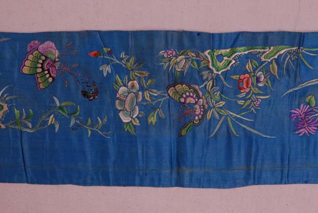 “挽袖”又称衣袖,是清代妇女上衣的装饰性袖口,多取刺绣工艺,针法多变,题材广泛。挽袖一般是一对,该挽袖只余一只,在蓝色地上彩绣蝶恋花纹,此类纹样寓意美好的爱情,故深受人们喜爱。所用针法以平绣为主。