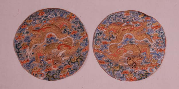 该绣片,一对,圆形。主体纹样为龙纹。龙身以大量的金线盘绣而成,游龙周围则是大量的云纹,以及少量的江崖海水。