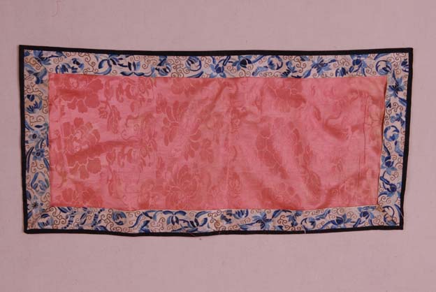 该暗花织物,红色,其上所织纹样为牡丹蝴蝶,花蝶纹是常用的吉祥纹样。织物周边镶有花卉纹织锦,最外围则镶有黑边。