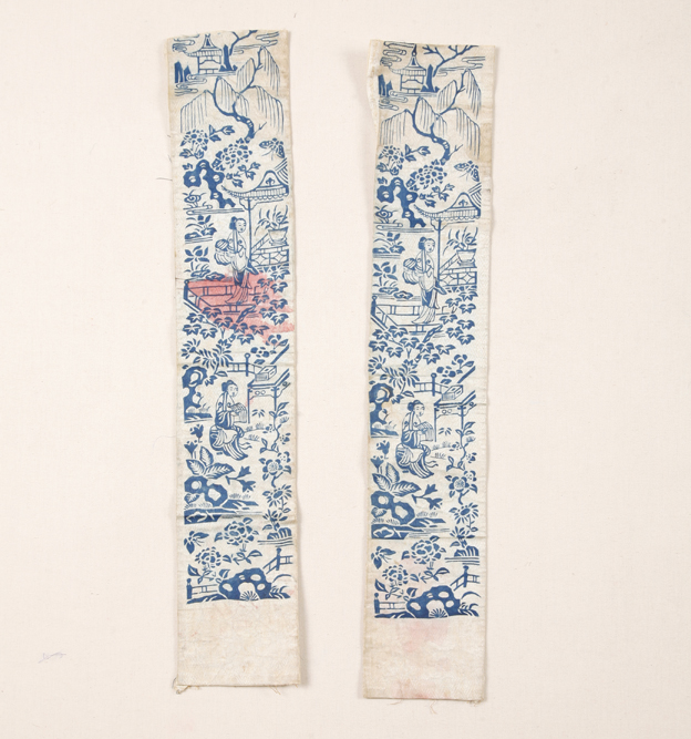 描述:该袖头共两块,面料均为白色万字地皮球花纹暗花绸,其基础组织为1/1平纹地上起3/1右斜纹花。该袖头以印花的方法显花,在类似花园的场景中有两个女子,一坐一立,皆手中捧有物品。