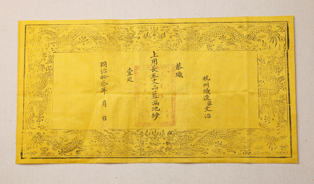 描述:匹料腰封,一般包于匹料外面,上书该匹料的名称、产地、数量以及年份等信息。这类传世腰封,可以作为织物定名的最好证据。