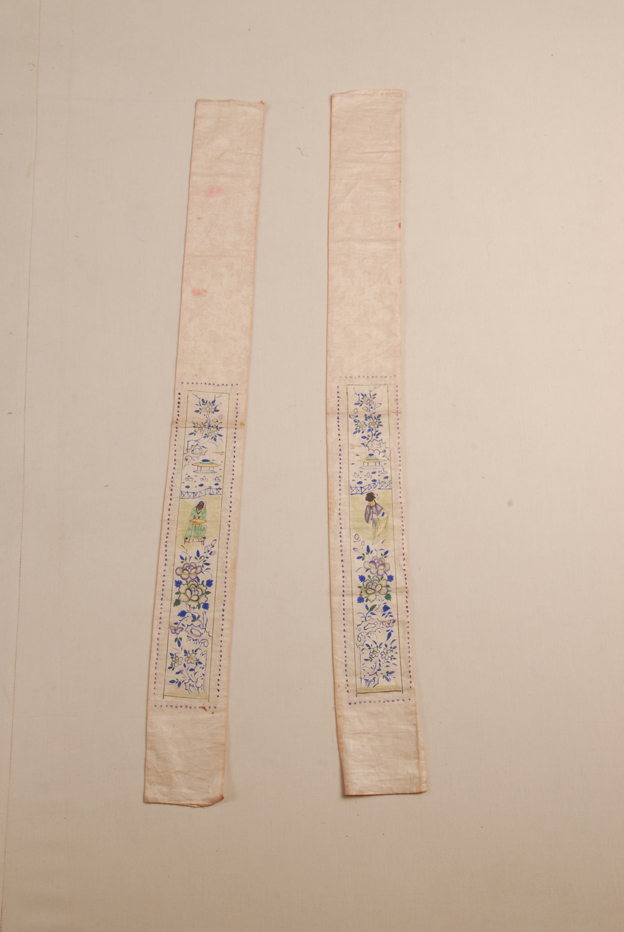 描述:该袖头共两块,面料均为白色花卉蝴蝶纹暗花缎,其基础组织为五枚缎纹地上起8枚缎纹花。该袖头各绘有约长44cm,宽8.5cm的图案带,其图案为花园地景,其中各绘有一个人物,一条为一男子,另一条则为一女子。