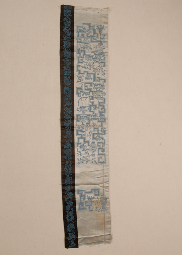 该件织物为织锦袖头,经线两色,分别为浅蓝及黑色;纬线为蓝色,为单层提花织物,其基础组织为八枚经缎上起八枚纬缎花,其图案为博古纹样。