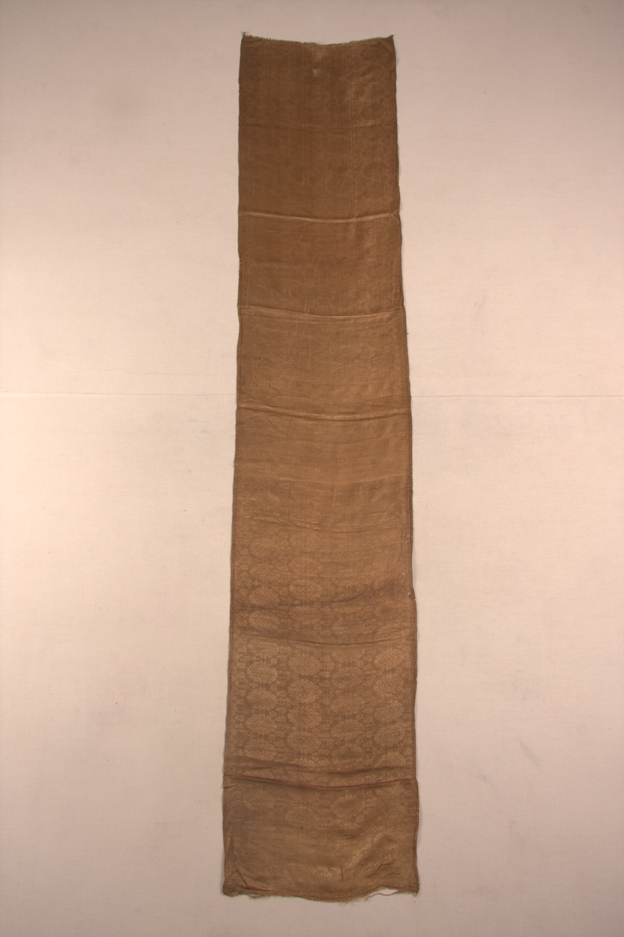 描述:此为一块棺垫,呈狭长形,保存较为完好,为暗花绸织物,其基本组织为1/1平纹地上以斜纹组织起花,花卉纹样。