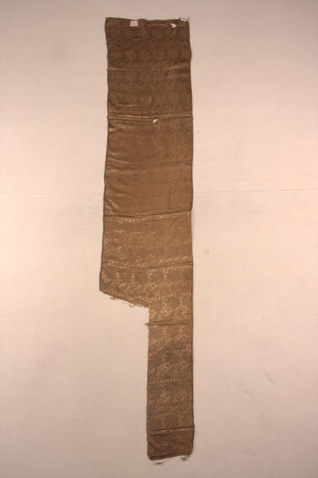 描述:此为一块棺垫,呈狭长形,一端缺一大角,为暗花缎织物,以正反缎组织织出图案,其图案排列为一排菊花、一排飞蝶。