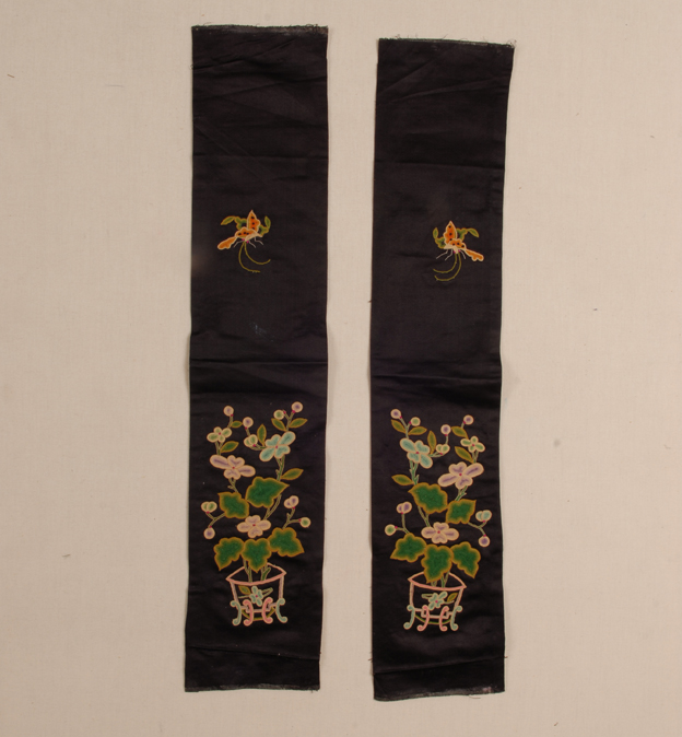 描述:该袖头共两块,面料均为黑色八枚素缎,其上以钉线绣的技法各绣出一盆花树及一只蝴蝶。