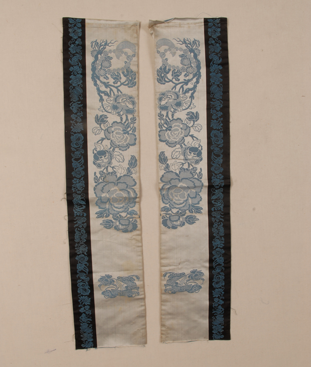 该袖头共两块,为单层提花织物,其图案为花卉纹样,经线两色,分别为浅蓝及黑色;纬线为蓝色,其基础组织为正反八枚缎。