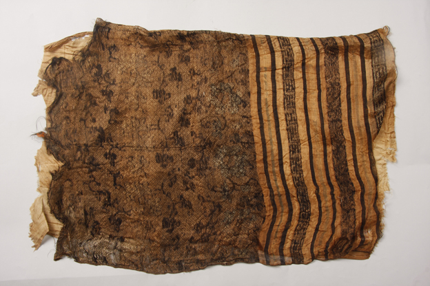 此件为一棺垫的残片,共两片,破损严重,为提花绸织物,其图案分为两部分,一段为黄、黑相间的条纹图案,另一段则为花卉纹样。